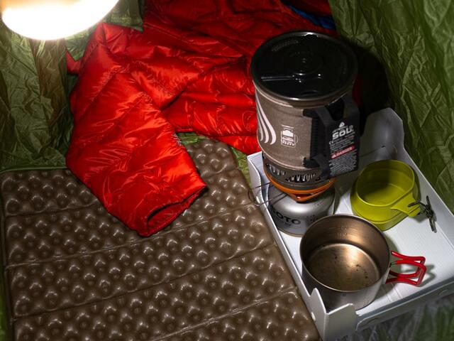 冬のテント泊に欠かせない断熱性の高いエアマット。