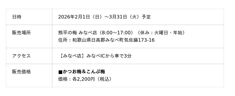 2026年2月1日(日)~3月31日(火)予定 場所:熊平の梅 みなべ店