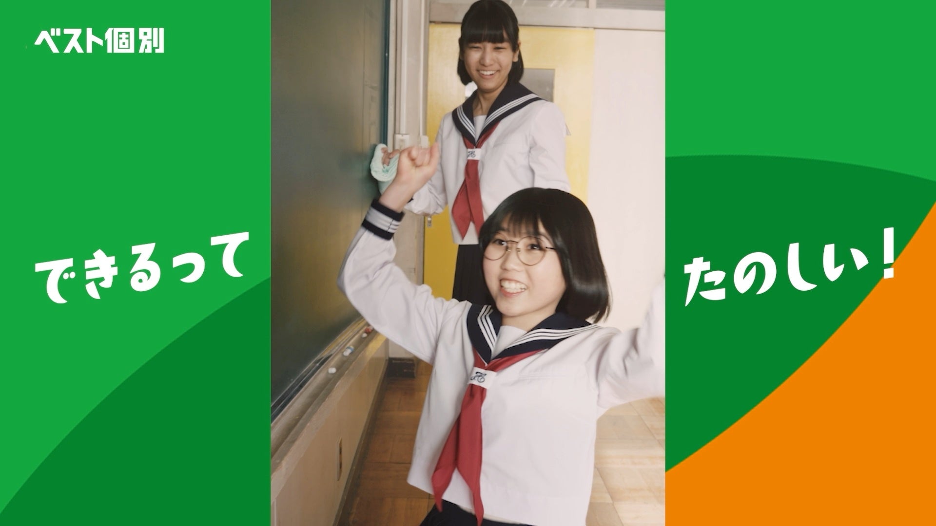 「ベスト個別」が大切にする「“できる”を楽しめ」をお届けするために、こどもたちの日常にある”できる喜び”と、学習の中での”できた”という体験を組み合わせて構成したCMです。