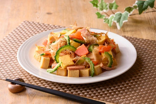 ゴーヤのほろ苦さと豆腐、卵のやさしい旨みにシークヮーサーの酸味が調和した沖縄の定番料理。