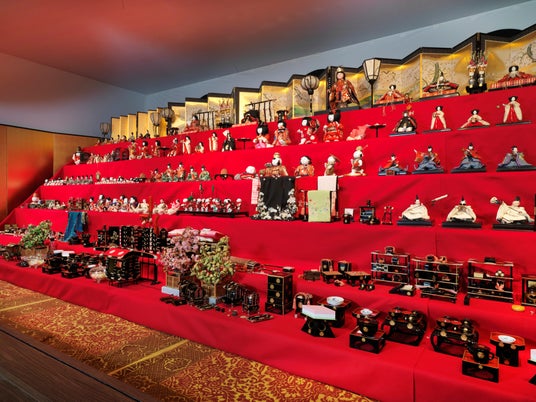 明治・大正・昭和、三世代にわたる尾張徳川家当主夫人の雛人形や雛道具が飾られた大雛段飾りは高さ2m、幅7mにも及ぶ
