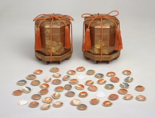 今年は、婚礼調度の貝桶と、それを小さく仕立てた雛道具の貝桶を並べて展示し、その精巧さを比較してご紹介いたします。写真左は公家の近衛家から尾張徳川家に嫁いだ福君(さちぎみ)の貝桶。菊の折枝と両家の家紋が散らされています。写真右は雛道具の貝桶ですが、散らされたモチーフが同じであることがおわかりいただけますでしょうか。また、貝桶の中に納められた合貝にも注目です。大小いずれも素材はハマグリで、小さいからといってシジミなどで代用することはありません。実物同様に小さなハマグリを用いて作られており、細部にまで妥協のないこだわりを感じることができます。