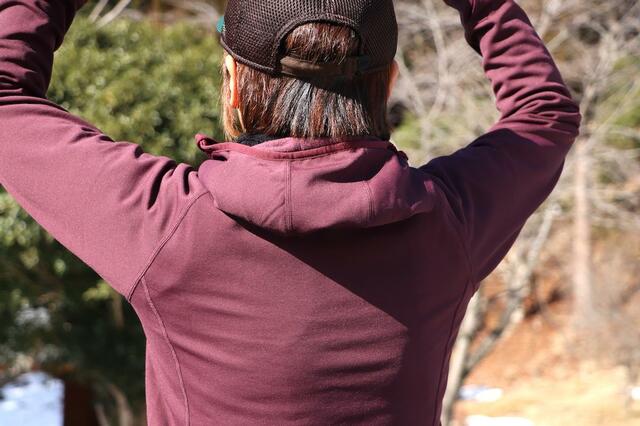 両手を挙げていてもしっかり生地が伸びているのが分かります。