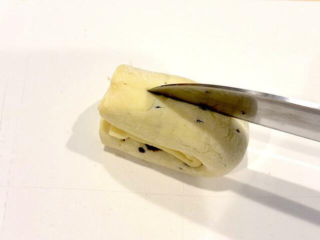 今回はクルミがあったので、生地に置いて、一緒に巻いたものもつくってみました。