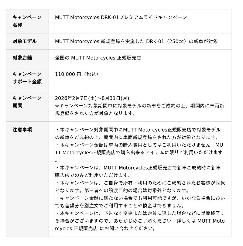 - MUTT Motorcycles DRK-01(250cc)の新車購入が対象