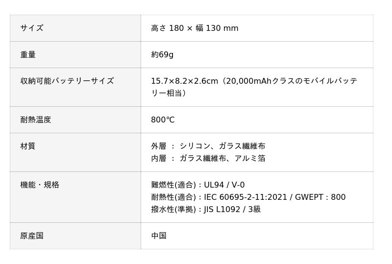 本製品は、モバイルバッテリー等の発熱・発火など万一の事故による被害の抑制を目的とした、毎日持ち歩ける防災対策アイテムです。外層にシリコンコートとガラス繊維布、内層にガラス繊維布とアルミ箔を重ねた4層構造により炎や熱の拡散を抑える設計を採用し、最大800℃の耐熱性能を備えています。「毎日持ち歩く防災」をテーマに、普段使いを意識したこれまでにないスタイリッシュなデザインと、手に取りやすいサイズ感を両立。肌触りの良いシリコンコートには撥水機能を持たせ、カラーは3色を用意しました。さらに、洗練された縫製により、防災対策アイテムとしてだけでなく、ガジェットポーチや保管用の難燃性ケースとしても幅広く活用できます。