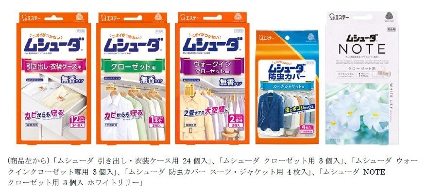 2024年2月には“防虫・香り・防カビ”の機能を備えた“清潔”と“シンプル”がテーマの防虫剤「ムシューダ NOTE(ノート) クローゼット用」を発売。2024年7月には「ムシューダ NOTE 引き出し・衣装ケース用」を新たにラインナップしました。その後発売された消臭芳香剤「消臭力 NOTE クローゼット用」と、除湿剤「ドライペット NOTE 置き型タイプ」とあわせた「NOTEシリーズ」として、「はじめよう、エステークローゼット。」をテーマに、「大切な衣類を安心して収納できる」という価値を収納環境に提案しています。