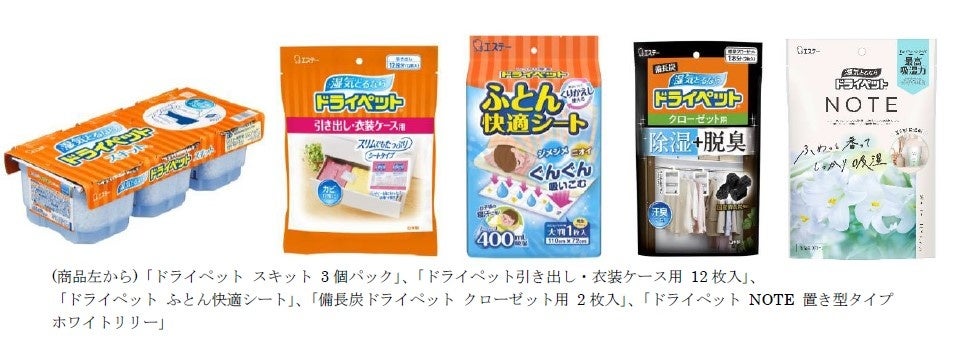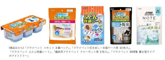 また、除湿剤に備長炭と活性炭を配合した、除湿に加えて脱臭もできる「備長炭ドライペット」や同シリーズのシートタイプもラインナップしています。2025年8月には、収納空間に上質で清潔感のある香りがふわっと広がる、除湿剤の「ドライペット NOTE 置き型タイプ」を新発売しました。