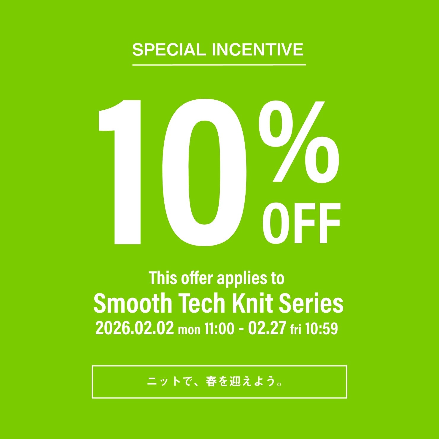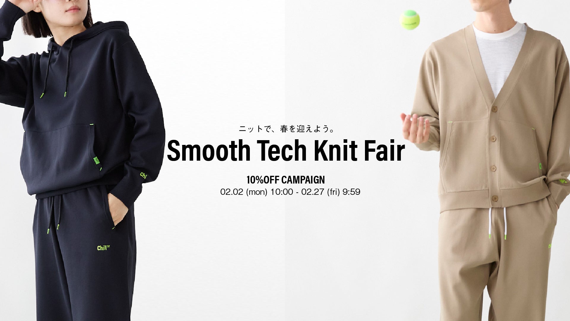 今回、「よりアクティブに街でも活躍するSmooth Tech Knitを着て、春を迎えよう。」をコンセプトにした『Smooth Tech Knit Fair』を開催。2月2日(月) 10:00~2月27日(金) 9:59の期間、Chill STの公式オンラインストおよび公式ショップにて、Smooth Tech Knitシリーズが10%OFFでお買い求めいただけます。