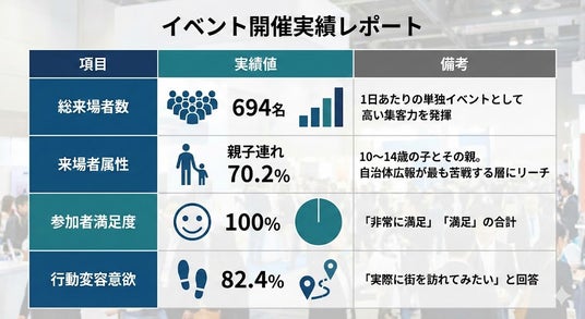 【圧倒的な動員力】 来場者数694名、満足度100%(回答数57名)記録。特に10代前半とその保護者層(70.2%)へのリーチに成功し、自治体の課題である「若年層・ファミリー層への訴求」を達成。