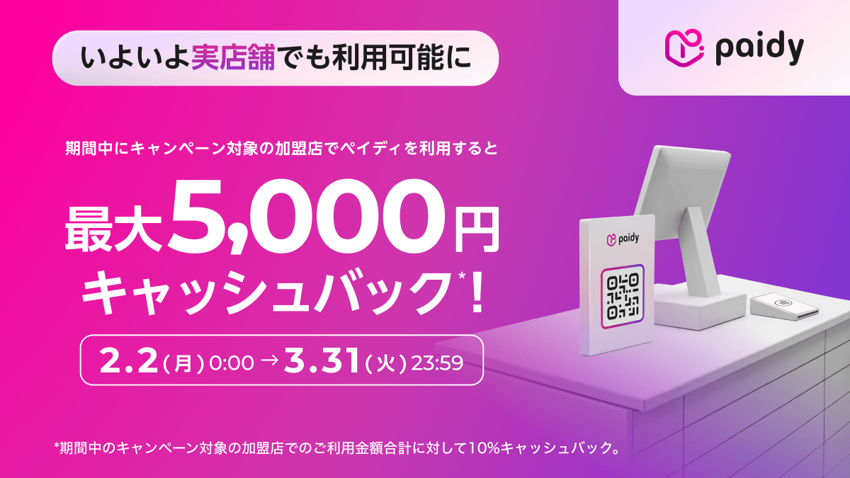 ●概要:新規に対面決済のお買い物向けにペイディを導入される事業者様を対象に加盟店手数料を2ヶ月無料*●キャンペーン対象:2026年2月2日~3月31日に新規にお申し込みいただいた法人のお客様