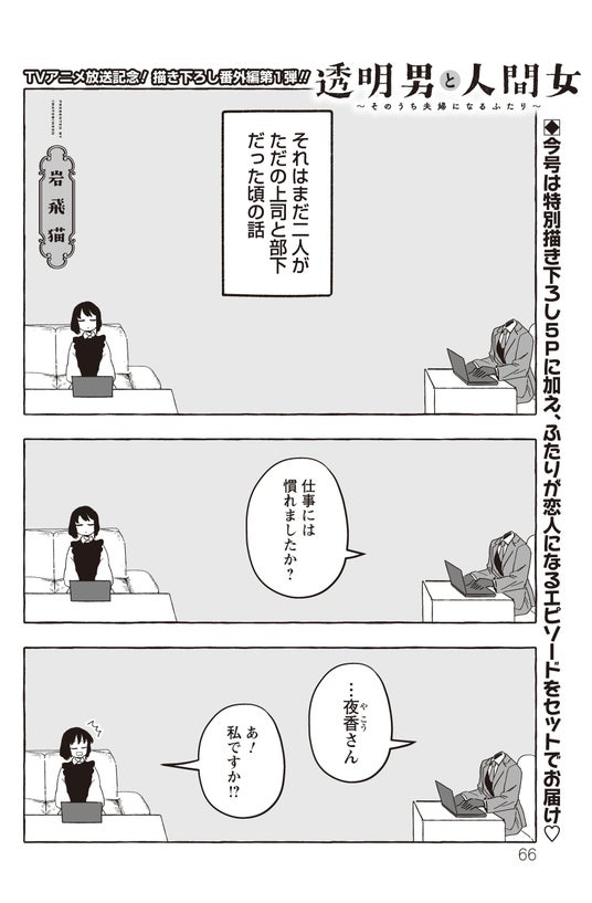 TOKYO MXほかにてTVアニメが絶賛放送中の『透明男と人間女~そのうち夫婦になるふたり~』。放送を記念し、描き下ろし特別番外編5pを掲載!探偵事務所の事務員として働きはじめた夜香さんは、上司である透乃眼さんの言葉に一喜一憂…? まだ付き合う前、上司と部下だったころの初々しい距離感のふたりをぜひお楽しみください。
