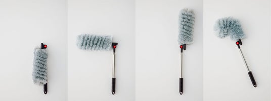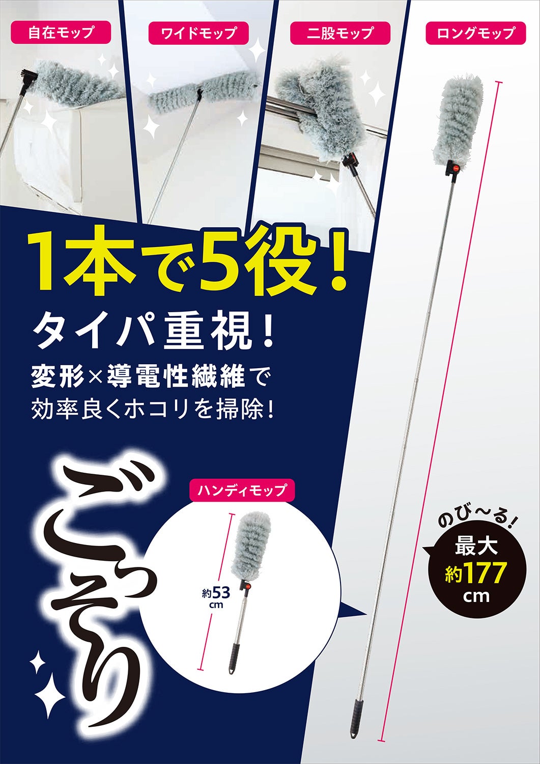 柄は最大 約177cm まで伸びる伸縮タイプ。脚立に上らなくても、天井や壁の上部、ライトまわり等の高所のホコリまでラクラクお掃除できます。縮めれば 約53cm になり、ハンディーモップとしても使えるのが便利なポイント。使い終わったら縮めてコンパクトに。フック穴付きなので収納もスマート。ブラシ2個付き。