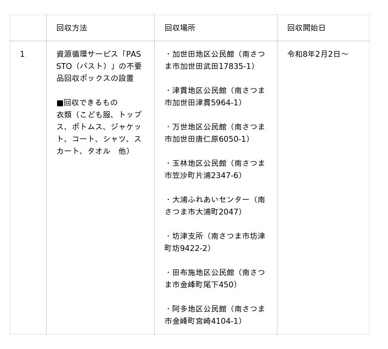 本協定により、令和8年2月2日から、ECOMMITが運営する資源循環サービス「PASSTO(パスト)」の不要品回収ボックスを、市内8拠点に設置し、ご家庭で不要になった衣類などを廃棄するのではなく、リユースへと繋げる仕組みを提供することで、地域全体で資源循環に取り組みます。