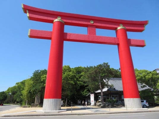 日本三大鳥居のひとつ、高さ21.7mもある朱塗りの大鳥居が目を引く神聖な場所です。
