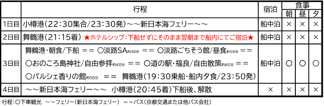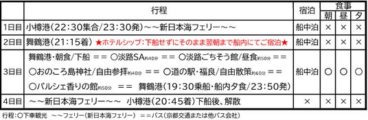 新日本海フェリー往復乗船代・食事代(朝1回・昼1回・夕1回)・バス代(3日目)・消費税等諸税