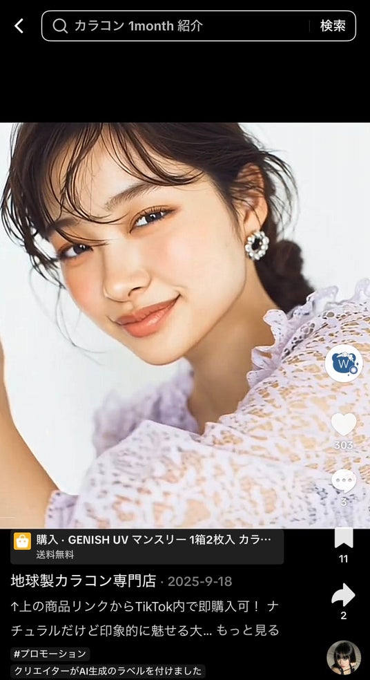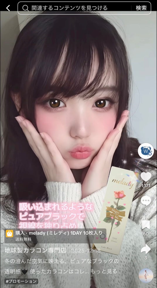 これにより、単なる画像・動画生成にとどまらず、“ブランドの世界観を科学的に理解し、創造的に表現する”という新しいビジュアルアプローチを実現しております。今回、その取り組みの一環として、TikTokショップ『地球製カラコン専門店(@earthmade_lens)』においてAIモデルの画像・動画を正式導入しました。
