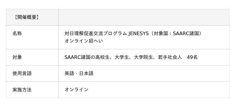 外務省が推進する国際交流事業「対日理解促進交流プログラム(JENESYS)」の一環として、SAARC加盟国の青少年のオンラインプログラムを実施いたします。