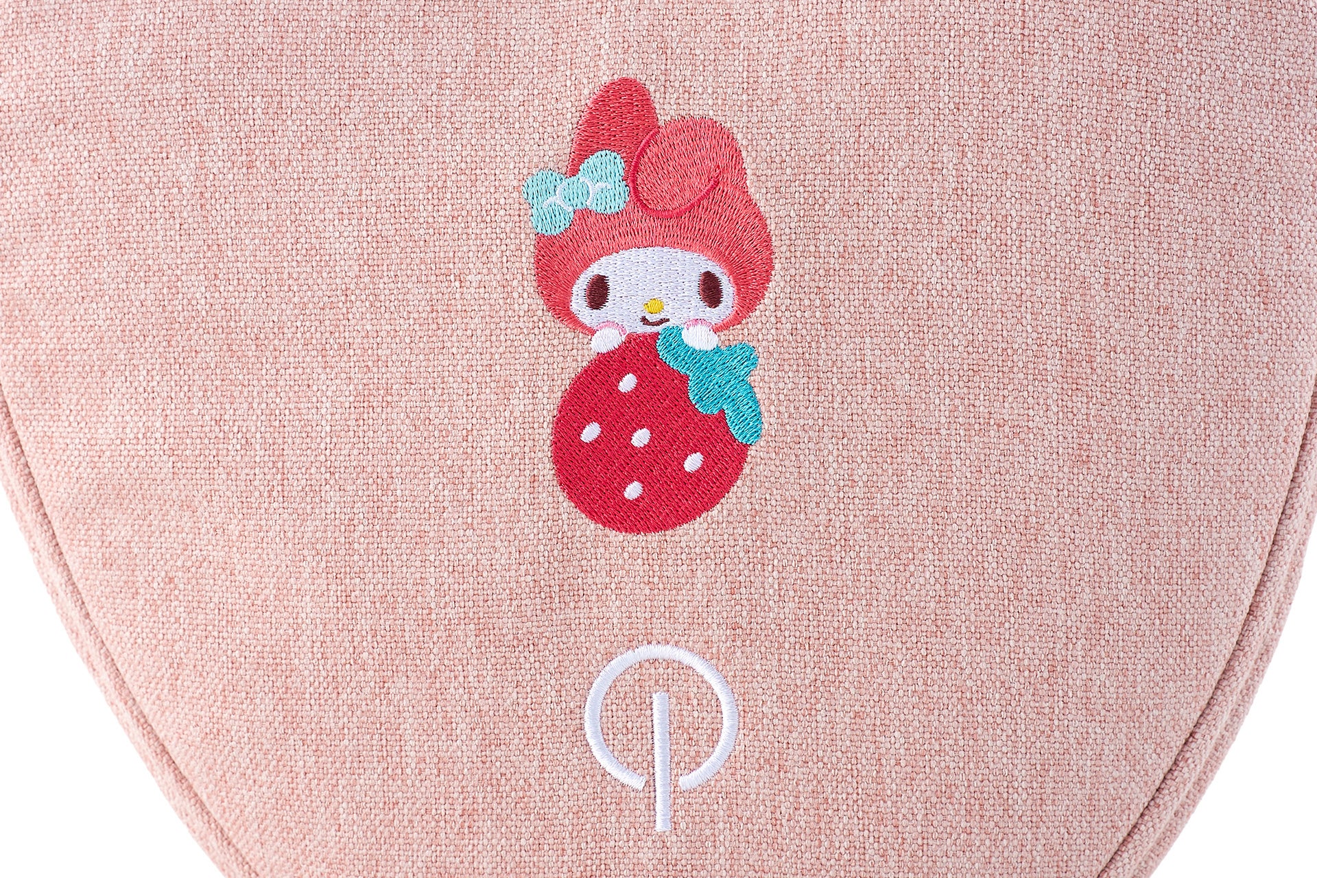 マイメロディとイチゴのモチーフを、やさしい風合いの刺繍であしらったクッション。
