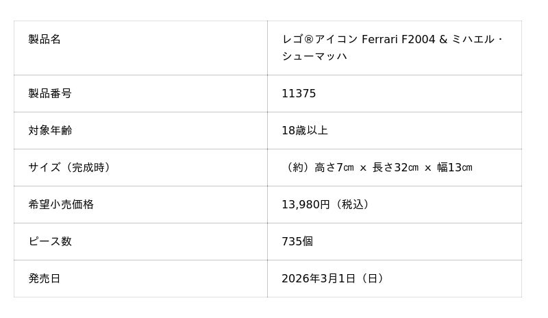 レゴジャパン株式会社(代表取締役社長:マイケル・エベスン/所在地:東京都港区、以下レゴジャパン)は、大人の『好き』や『情熱』をクリエイティブに自分で表現できる大人向けのレゴ(R)ブロックから、2004年 のF1シーズンを席巻した伝説の「Ferrari F2004」をリアルに再現した「レゴ(R)アイコン Ferrari F2004 & ミハエル・シューマッハ」を2026年2月2日(月)10時より予約受付開始、3月1日(日)より一般販売します。(※一部店舗により予約販売の日時が異なります)