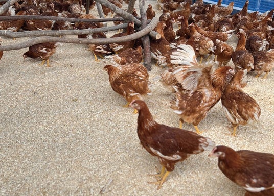動物福祉(アニマルウェルフェア)の考え方を重要視低密度の平飼いで健康的にのびのびと鶏舎内を走り回り約5%の割合で雄鶏を入れて自然に育てています。