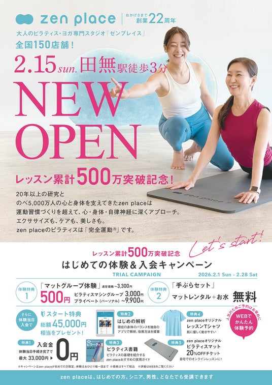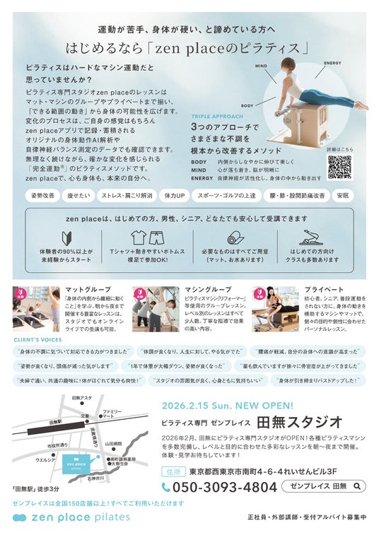 最先端研究結果・科学をもとに、グローバルな環境で最新技術とDXで挑戦を重ね、サービス業界にイノベーションを起こしている最先端のWeb3.0 DX企業であり、ウェルビーイング創造のリーディングカンパニーである株式会社ZEN PLACE(本社:東京都渋谷区 代表取締役:尾崎成彦)は、西武新宿線 田無駅より徒歩3分の好アクセス・好立地に広々とした開放的なスペースに各種マシンを完備したピラティス専門スタジオ「zen place pilates 田無スタジオ」を2026年2月15日(日)にオープンします。
