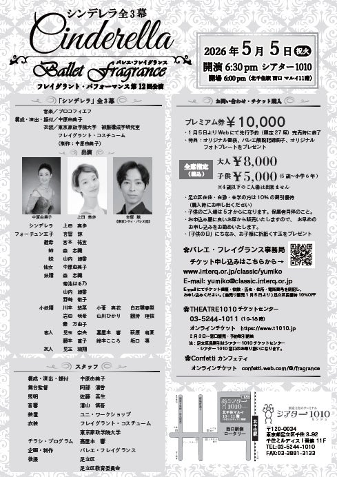 バレエ・フレイグランス(主宰:中原由美子)主催、『フレイグラント・パフォーマンス第12回公演「シンデレラ」全3幕』が2026年5月5日 (火・祝)にシアター1010(東京都 足立区 千住 3丁目92 北千住駅西口 マルイ11階)にて上演されます。