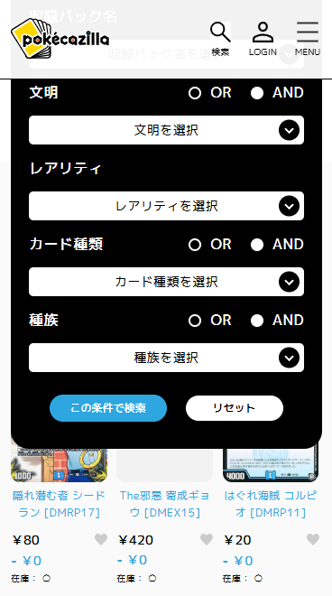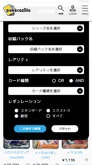 ポケモンカードゲームの検索メニュー。レアリティとレギュレーション絞り込み機能が既存ユーザー様に公表です。