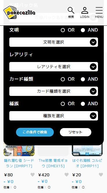 デュエル・マスターズの検索メニュー。「文明」「種族」が選択可能です。