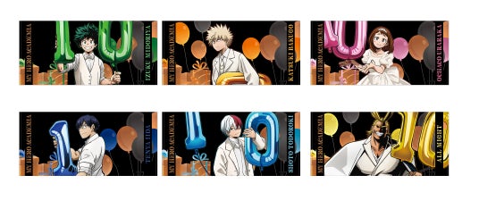 新規描き下ろしビジュアルを使用した「アクリルスタンド」や「オーロラキャラバッジコレクション」などの新商品が多数発売! 緑谷出久や爆豪勝己ら6人がフォーマルな衣装に身を包んだ10周年のお祝いにぴったりな描き下ろしビジュアルとなっています。