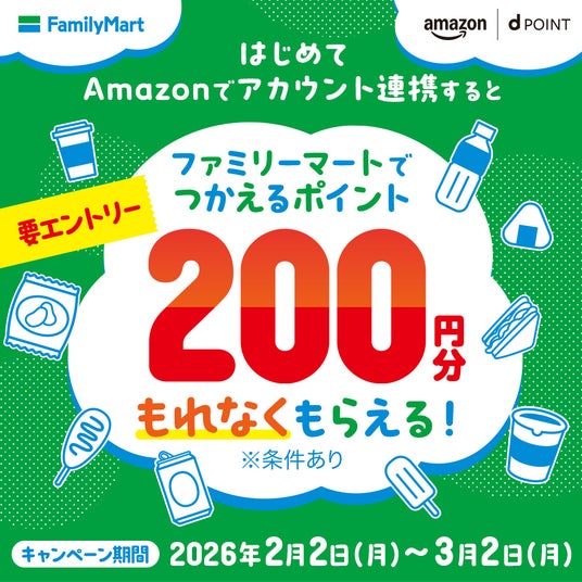株式会社NTTドコモ(以下、ドコモ)は、「Amazonではじめてアカウント連携すると、ファミリーマートでつかえるポイント200円分がもらえるキャンペーン」(以下、本キャンペーン)を、2026 年2月2日(月)から2026年3月2日(月)までの期間で開催※1いたします。