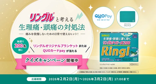 佐藤製薬株式会社(本社:東京都港区、社長:佐藤誠一)は、2026年2月2日(月)よりQUOカードPayまたはオリジナルブランケットが当たる『「リングルと考える生理痛・頭痛の対処法」クイズキャンペーン』を実施いたします。