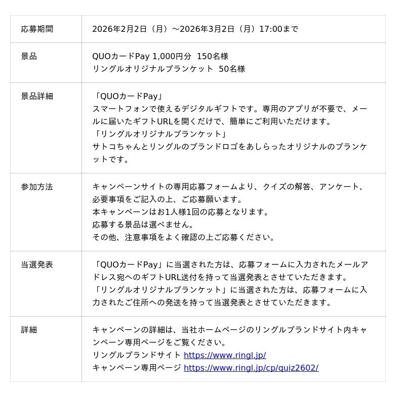 キャンペーン期間中、キャンペーン専用ページ上でリングルや鎮痛薬に関するページを見て、クイズに正解された方の中から抽選で200名様に、QUOカードPay 1,000円分またはリングルオリジナルブランケットをプレゼントいたします。