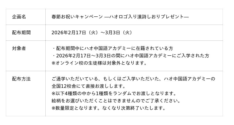 株式会社イーオン(本社:東京都新宿区、代表取締役社長:重野卓、以下「イーオン」)が運営するハオ中国語アカデミーは、2026年2月17日(火)~3月3日(火)の期間、ハオ中国語アカデミーの生徒の皆様、そして新たに学びをスタートされる新入学者の皆様に「漢詩しおり」をプレゼントいたします。
