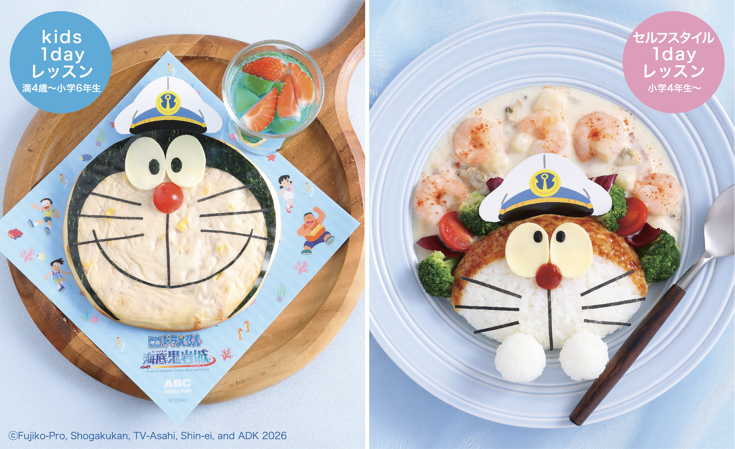 千代田区丸の内、代表取締役社長 兼 CEO : 志村なるみ、以下ABC)は、『映画ドラえもん 新・のび太の海底鬼岩城』の公開を記念し、1回きりの料理教室1dayレッスンを3月・4月に開講いたします。4歳からの子どもを対象とした「kids1dayレッスン」と、小学4年生から大人を対象とした、動画を見ながら一人で作り上げる「セルフスタイル1dayレッスン」をそれぞれ開講し、映画の世界観をお楽しみいただきます。