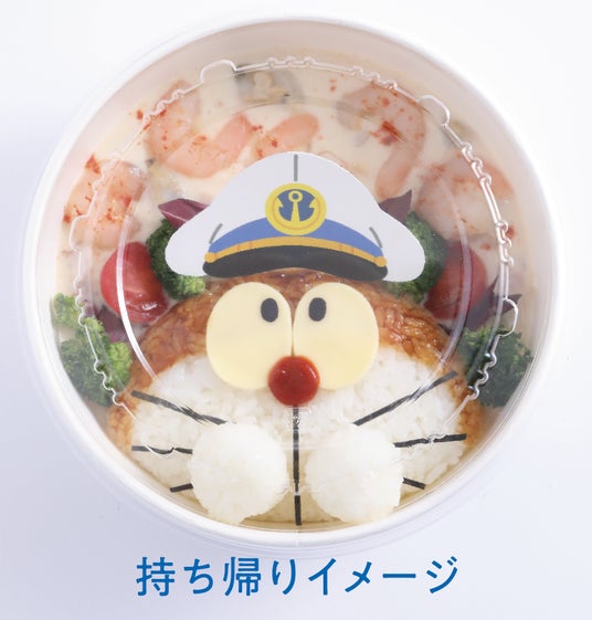 「海の幸のクリームシチュー」『映画ドラえもん 新・のび太の海底鬼岩城』をイメージした海の幸のクリームシチューです。ごはんで作るドラえもんのフェイスに、鍋で作るクリームシチューとカラフルな野菜を盛り付ければ出来上がり!ランチボックスに詰めてお持ち帰りします。カメレオンぼうしのピックは先着順なのでお早めに!