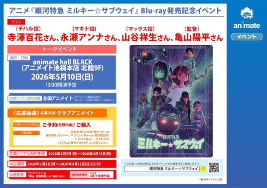 株式会社アニメイトは、2026年5月10日に「アニメ『銀河特急 ミルキー☆サブウェイ』 Blu-ray発売記念イベント」をアニメイト池袋本店にて開催いたします。