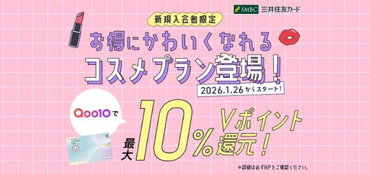 インターネット総合ショッピングモール「Qoo10(キューテン)」を運営するeBay Japan合同会社(本社:東京都港区、代表取締役:グ ジャヒョン)は、三井住友カード 株式会社(本社:東京都江東区、代表取締役 社長執行役員 CEO:大西 幸彦)の、三井住友カード新規会員限定!コスメ最大10%還元プランが2026年1月26日(月)よりQoo10で開始することを発表しました。本プランは、対象期間中に三井住友カードに新規入会し、Qoo10でお買い物すると、購入金額の最大10%のVポイントが還元されるお得なプランです。