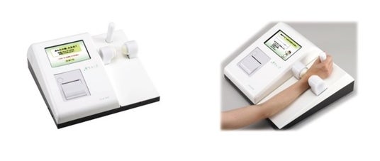 測定部位である手首(トウ骨)に超音波を伝播させ、透過した波の形から“骨の強さ”を算出できる機器です。靴下やストッキングを脱がず、約40秒で骨のセルフチェックをしていただけます。