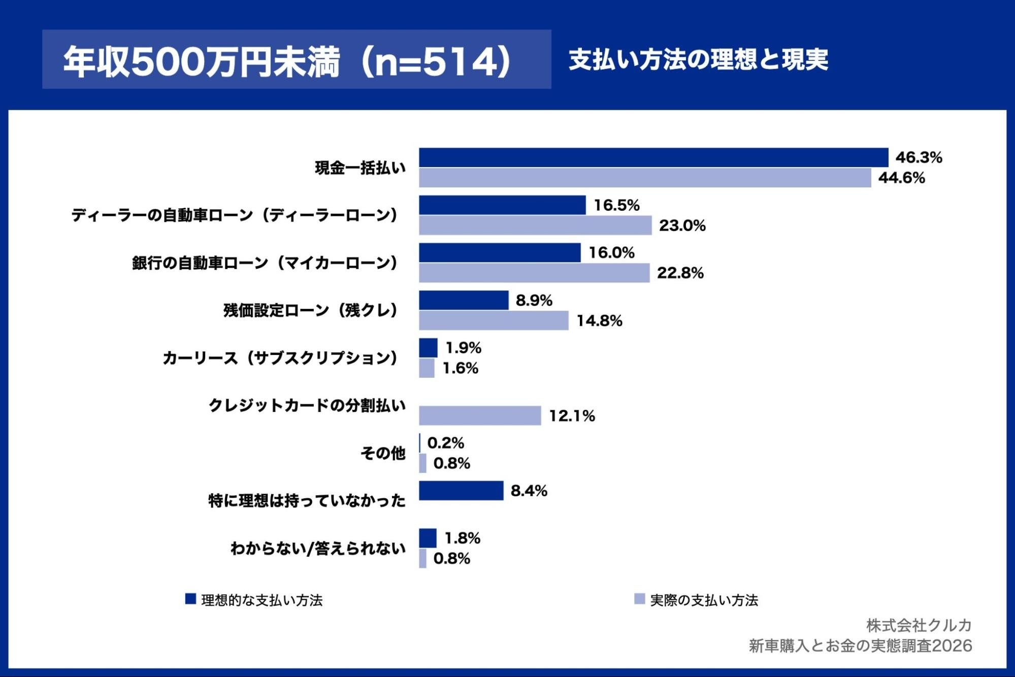 まず、年収別に「理想的な支払い方法」と「実際の支払い方法」の回答割合を比較しました。「現金一括払い」を理想とする割合は、年収500万円未満で46.3%、年収500万円以上1,000万円未満で50.4%、年収1,000万円以上で60.9%と、年収が上がるほど高くなる傾向が見られました。一方で、実際の支払い方法を見ると、年収500万円未満では銀行・ディーラーローンの利用率が理想を大きく上回っています。銀行の自動車ローンは理想16.0%に対し実際22.8%(+6.8ポイント)、ディーラーローンは理想16.5%に対し実際23.0%(+6.5ポイント)となり、理想と現実の間に明確なギャップが生じていることがわかりました。