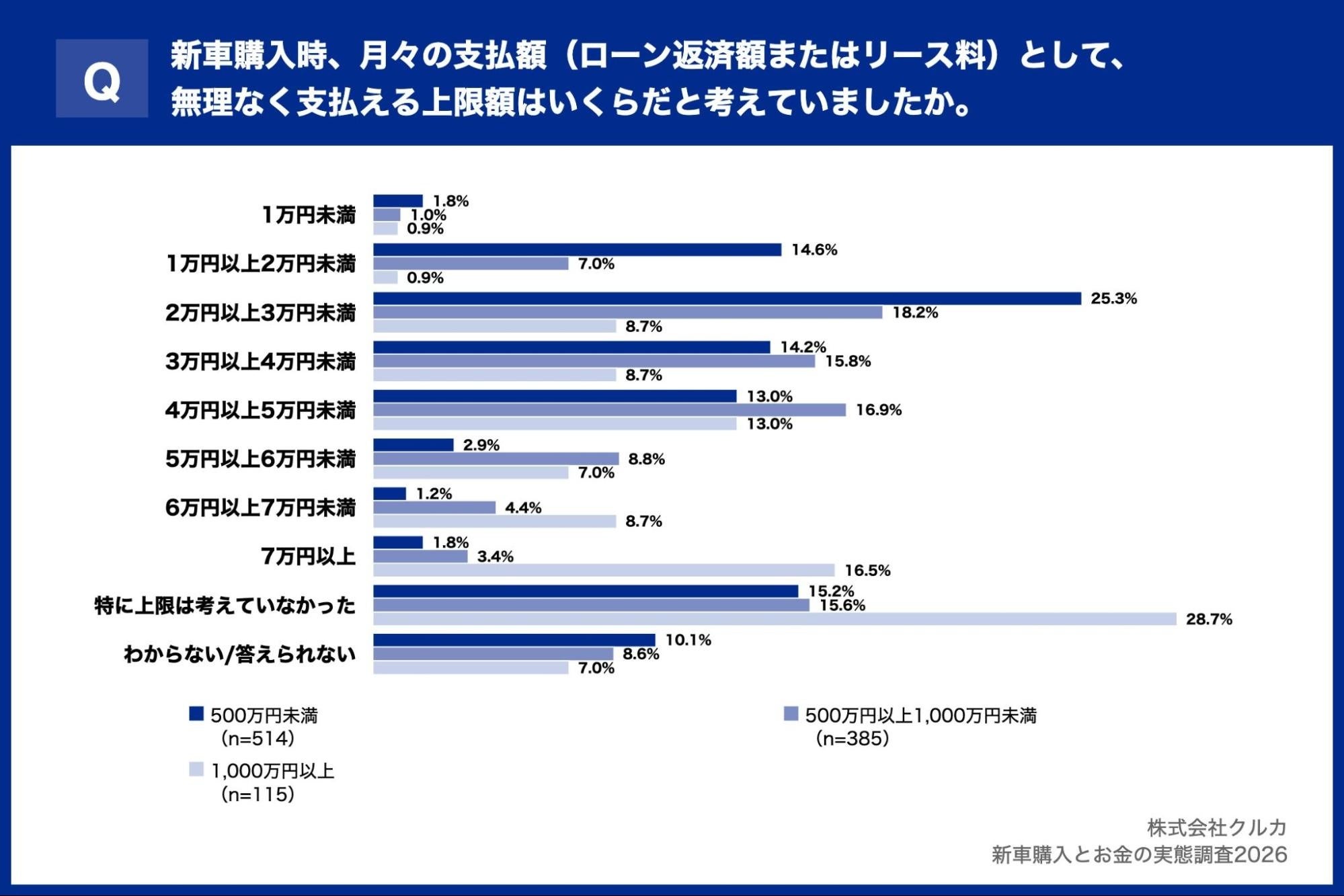さらに、「新車購入時、月々の支払額(ローン返済額またはリース料)として、無理なく支払える上限額はいくらだと考えていましたか。」と質問したところ、年収帯によって大きな差が見られました。年収500万円未満では「2万円以上3万円未満」が25.3%で最多となり、次いで「1万円以上2万円未満」14.6%、「3万円以上4万円未満」14.2%と、月々の負担を抑えた価格帯に集中しています。一方、年収1,000万円以上では「特に上限は考えていなかった」が28.7%で最多となり、年収500万円未満(15.2%)より13.5ポイント高い結果となりました。