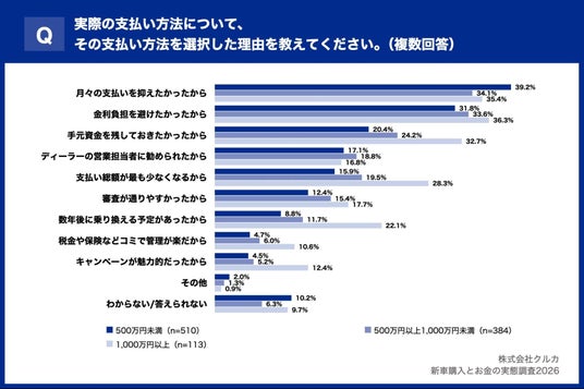 また、「手元資金を残しておきたかったから」と回答した割合は、年収500万円未満で20.4%、年収500万円以上1,000万円未満で24.2%、年収1,000万円以上で32.7%と、年収が上がるほど資産運用や将来への備えを意識する傾向がうかがえます。さらに、「数年後に乗り換える予定があったから」は年収1,000万円以上で22.1%と、年収500万円未満(8.8%)の約2.5倍となり、高年収層ほど計画的な乗り換えを前提とした支払い方法を選んでいることがわかりました。