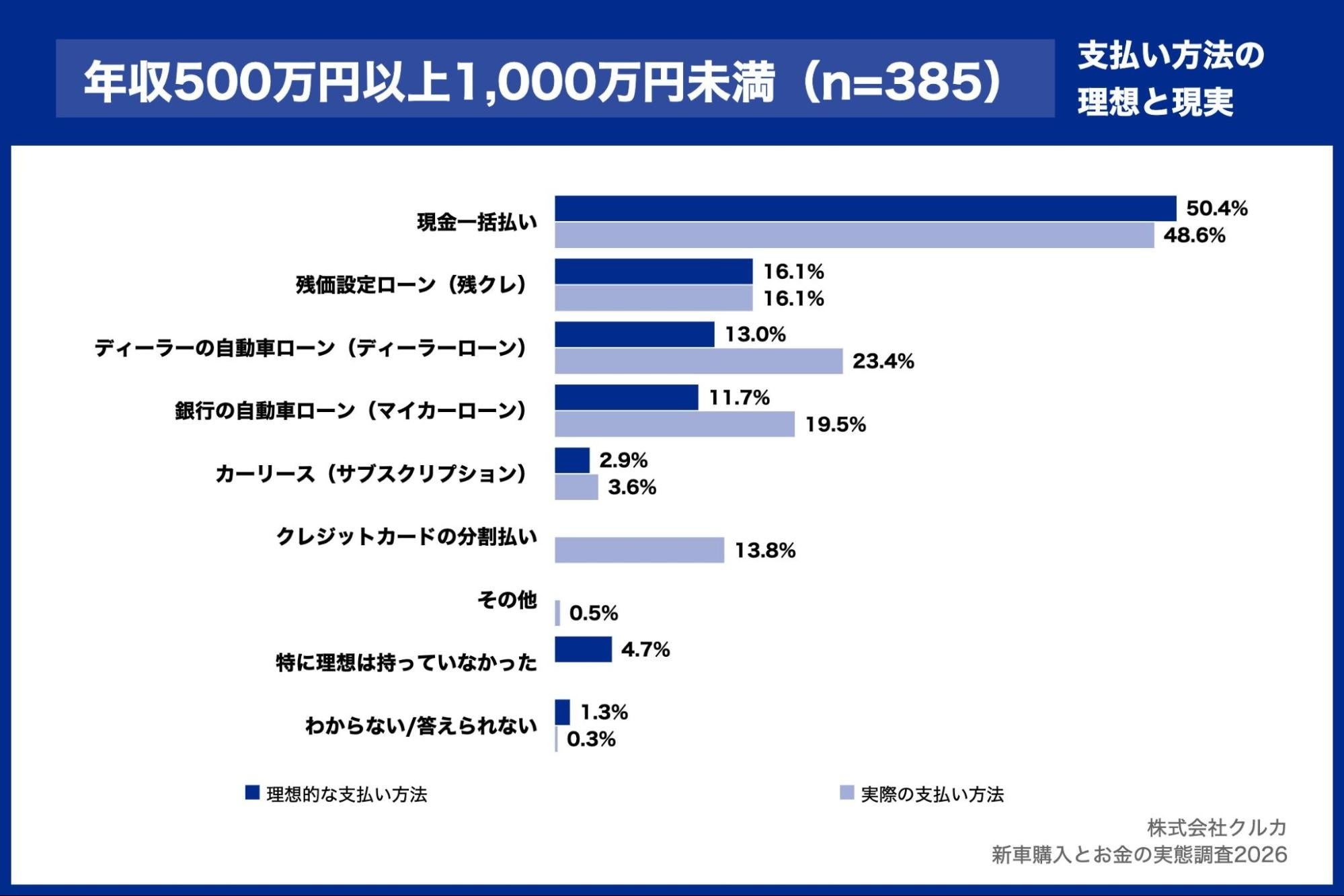 株式会社クルカは、直近3年以内(2022年1月以降)に新車を購入し、購入時の意思決定に関与した方 1,076名を対象に、新車購入とお金の実態調査2026を実施しましたので、お知らせいたします。本リリースでは、年収別に見た「理想の支払い方法と実際の選択のズレ」を分析した結果をお知らせいたします。