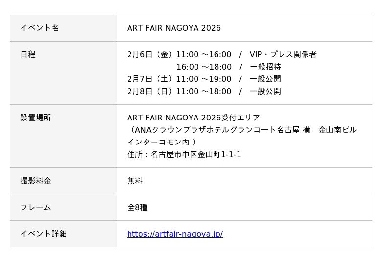 キタムラ・ホールディングス グループのピックハイブ株式会社(本社:東京都新宿区、代表取締役社長 兼 COO:大迫 由典)が運営するセルフフォトブランド「Photomatic(読み:フォトマティック)」は、2026年2月6日(金)から2月8日(日)の3日間、ANAクラウンプラザホテルグランコート名古屋で開催される『ART FAIR NAGOYA 2026』にセルフフォトブースを設置いたします。