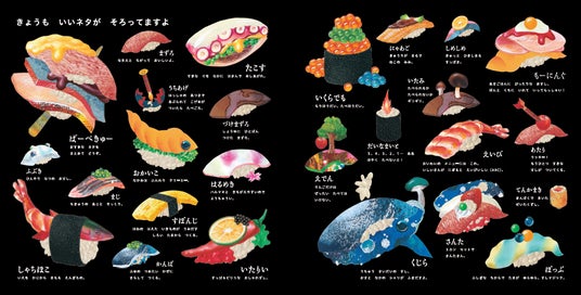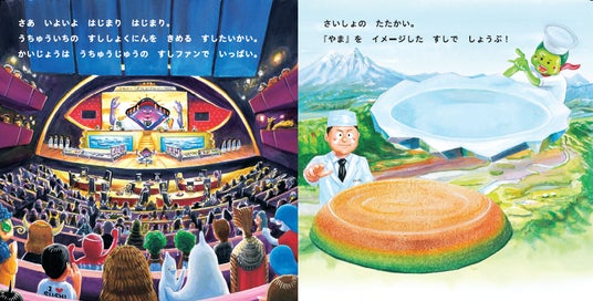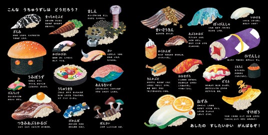 おいしそうなネタから楽しいネタまで、「うちゅうずし」の世界は広い! 「もーにんぐ」に「まずろ」、「ぴかんぽ」――どんなおすしかな? 絵本に添えられた楽しい一言メモにもご注目!