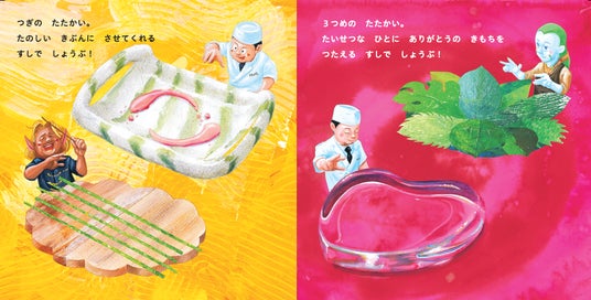 絵本に綴じ込まれたすしネタやシャリのシールを組み合わせて、オリジナルすしをつくり、「うちゅういち」のすし職人を目指します。