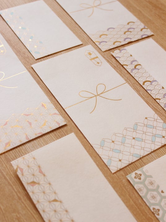 七宝や青海波などの伝統文様を金箔で表現した、美濃和紙ののし袋。