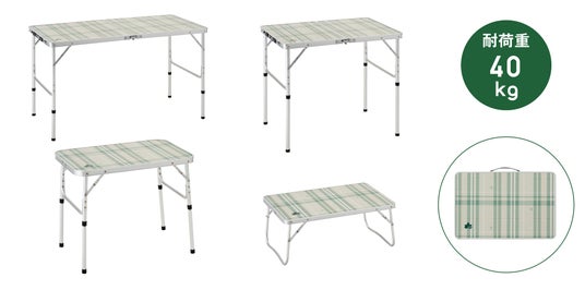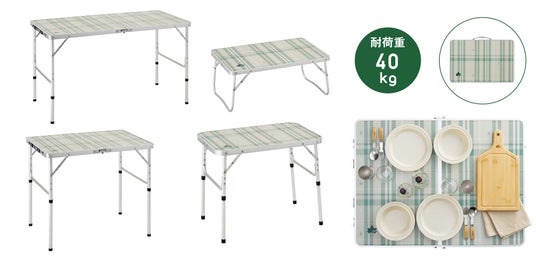 4種とも耐荷重は40kgと、食器や調理器具を並べても安心して使用できます。また、天板には、食卓を華やかに彩るテーブルクロス風デザインを採用し、キャンプの食事シーンをより楽しく演出します。