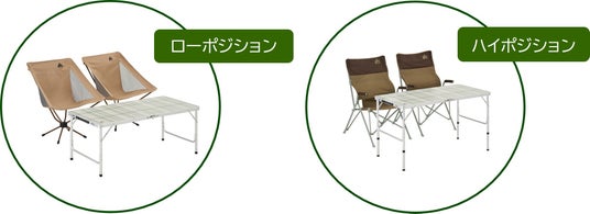 「2FD ダイニングテーブル 12060」「2FD ダイニングテーブル 8060」「ソリッドテーブル 6040」は、2段階の高さ調節が可能。高さを切り替えることで、子どもから大人まで快適に使用でき、チェアを使ったダイニングスタイルからロースタイルでのくつろぎシーンまで、スタイルに合わせたキャンプが楽しめる。
