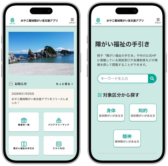 アプリ内では、宮古市からのお知らせをプッシュ通知やメールで確認できるほか、これまで冊子配布や市のホームページに掲載していた「障がい福祉の手引き」の内容をデジタル化しています。これにより、障害種別や等級といった条件から必要な情報を整理して確認できるようになるとともに、制度改正等があった場合にも内容を速やかに反映できるようになります。